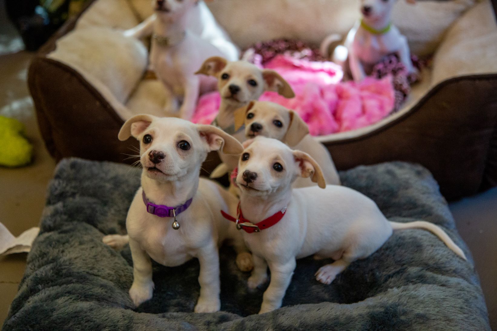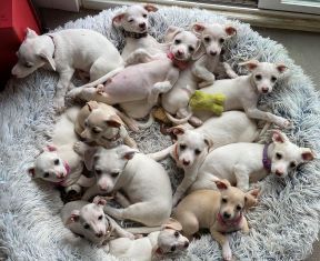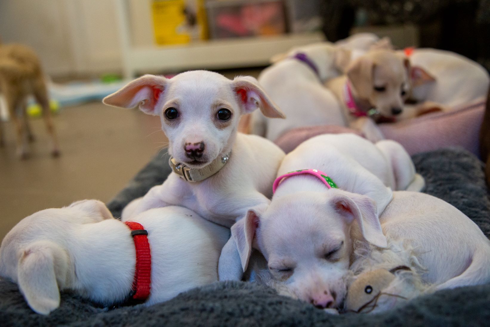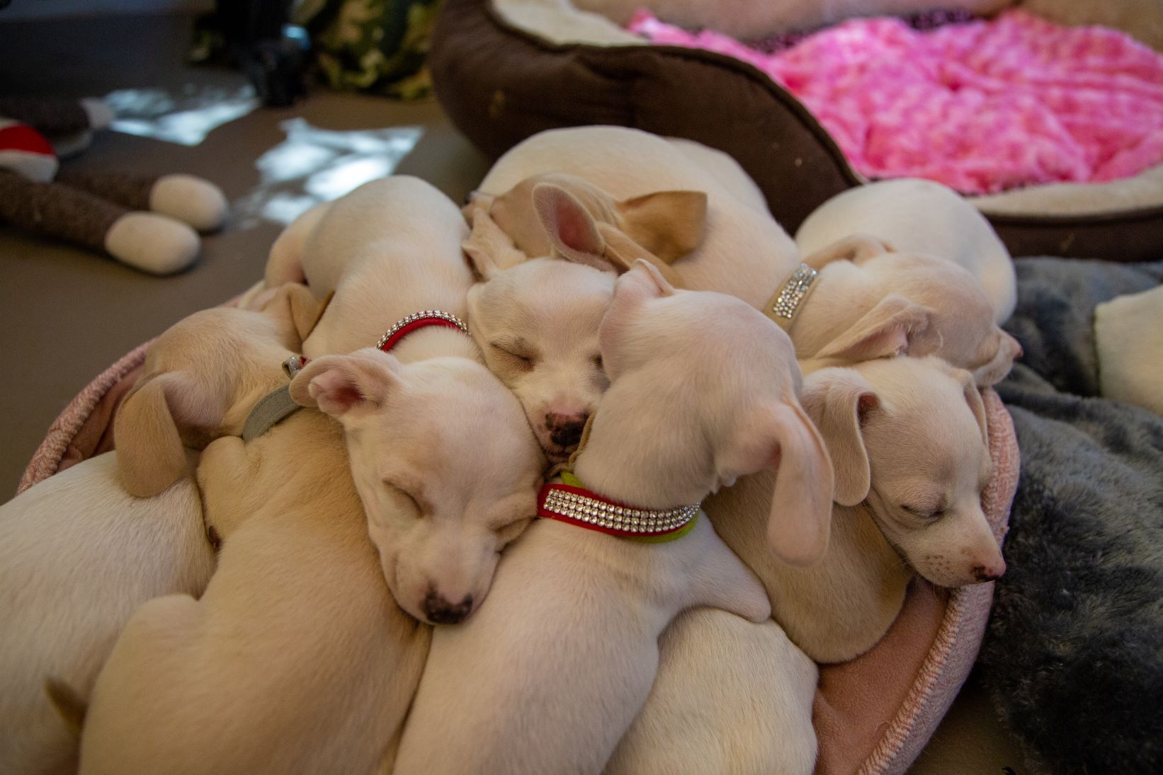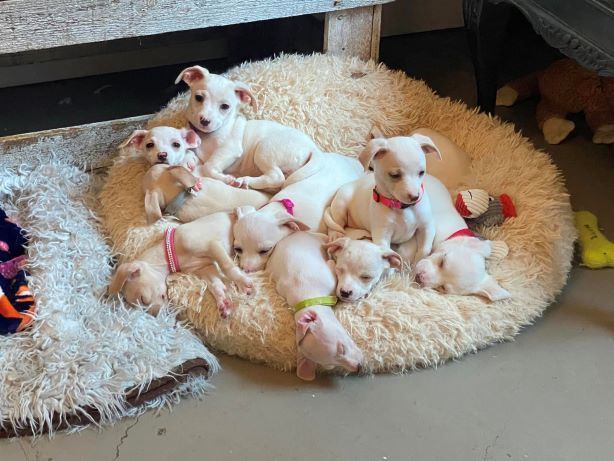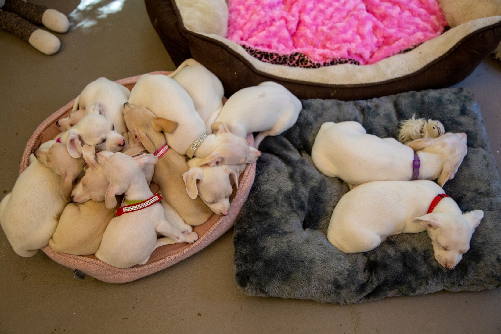 The 13 pups range in weight from 2 pounds, to 6 pounds. One litter is smaller than the other but they are all on the same page developmentally. They’ve had love and attention from so many people since the day they were born, which by the way, was January 24th.
