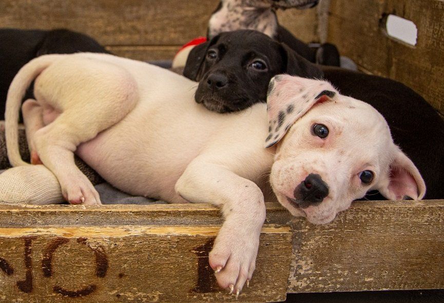 Charlie's rap sheet says he's a "White male chunky hunk of a sweet puppy with a super soft coat." Charlie is one of three puppies from the same litter that came to us from a rural Texas shelter (we had a total of six in this latest "delivery"). Although we haven't done any DNA testing, we think we see some Dalmation, but he and his siblings are definitely a mix of a few different things. Charlie is a special little guy.