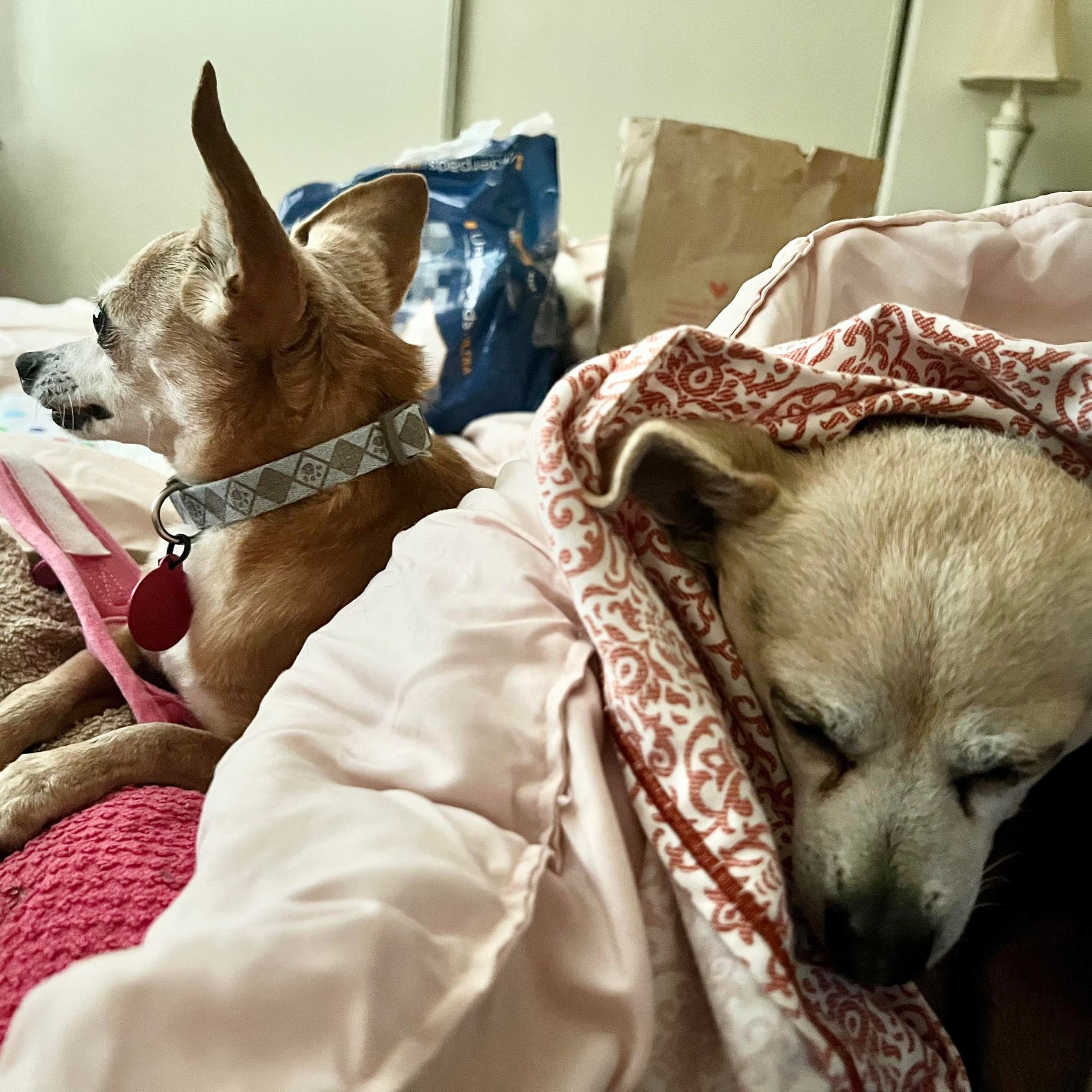This is the happiest possible scenario for two little senior girls who fell on scary times when their guardians could no longer care for them. Violet is in her travel bag on the floor while Daisy soaks up the love from their new mom in this pic.
