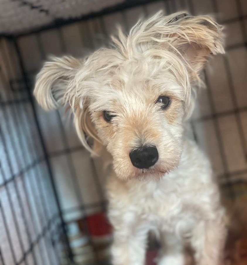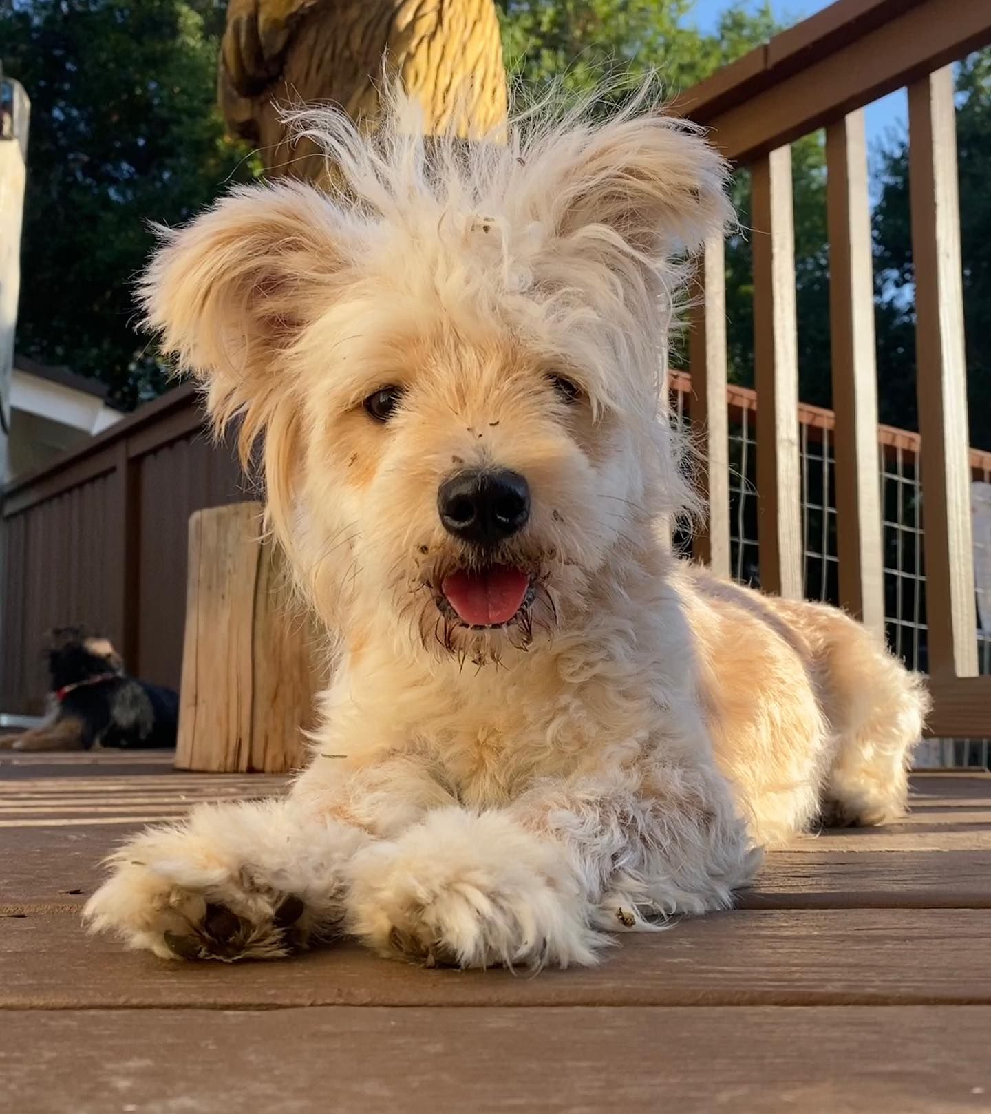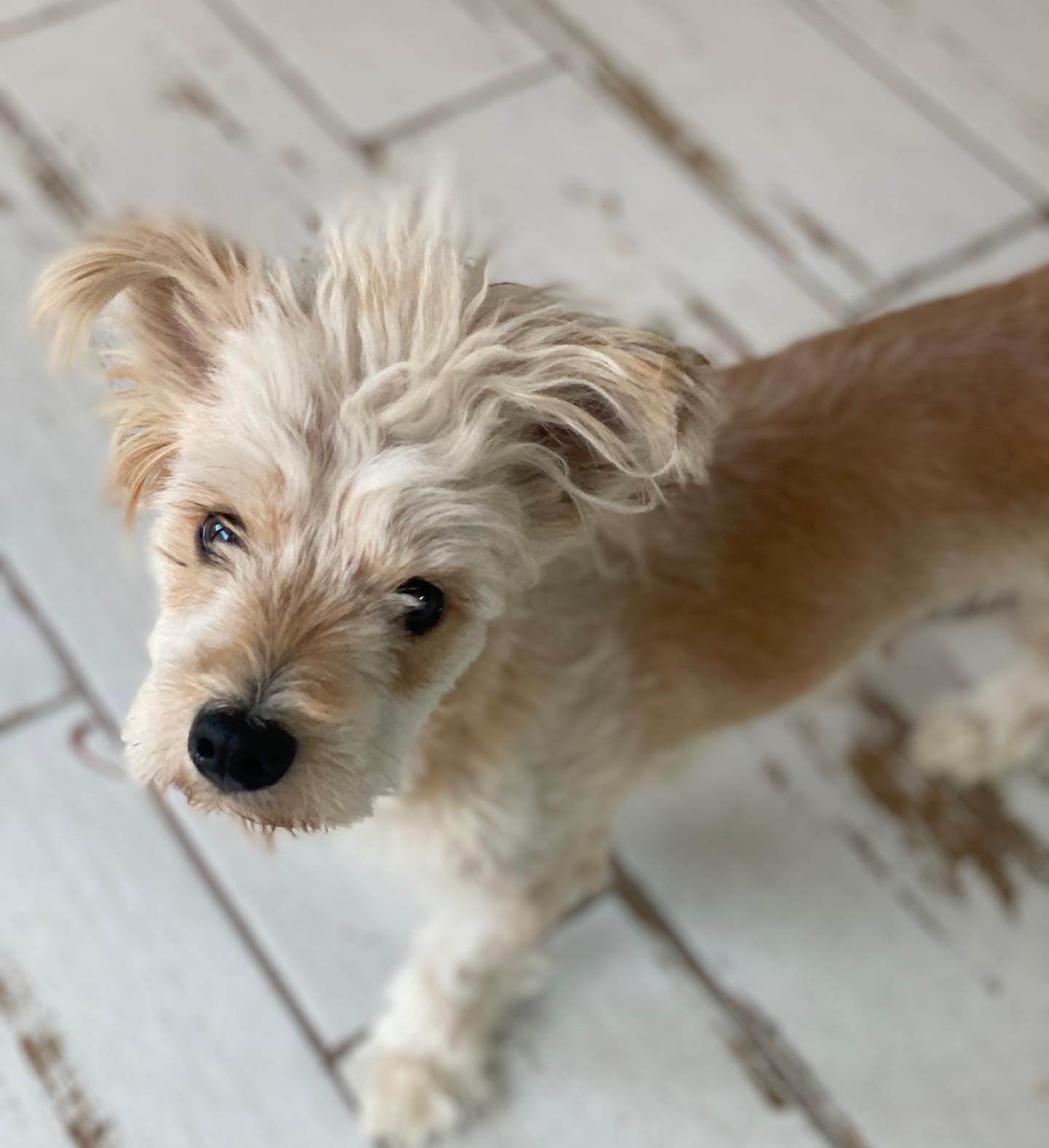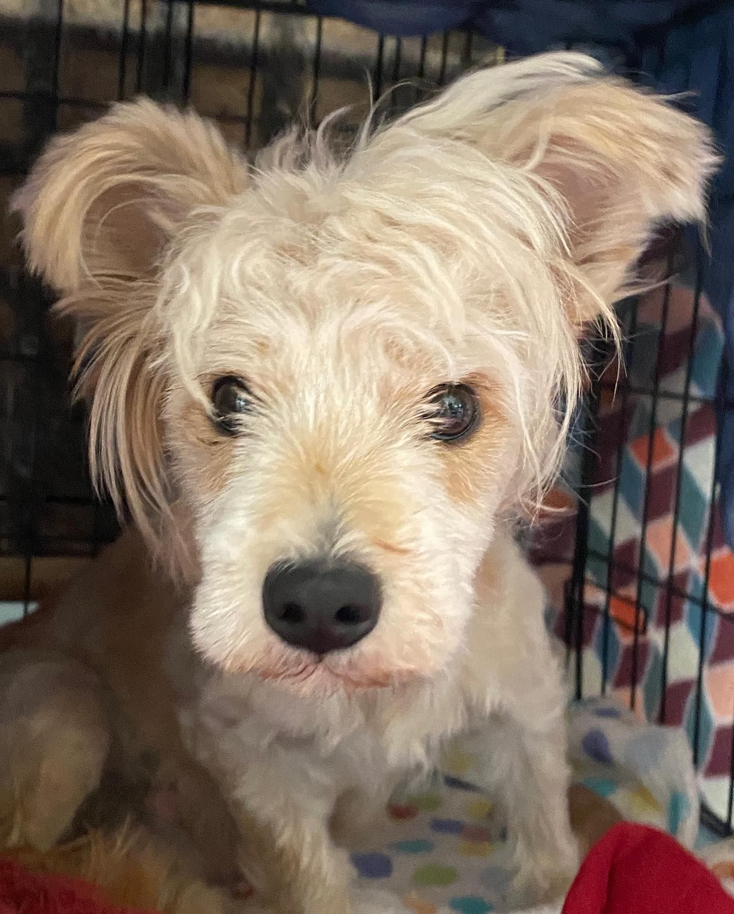 Foo Foo is young, perhaps around 3 years, around 12 pounds and has the shape of a doxy with the hair of a poodle mix.
