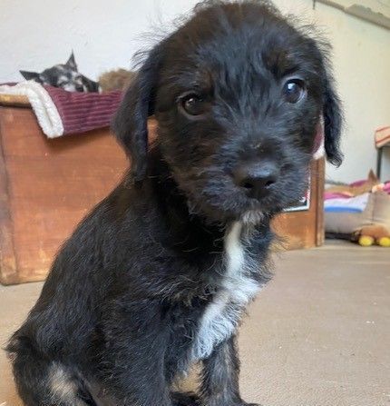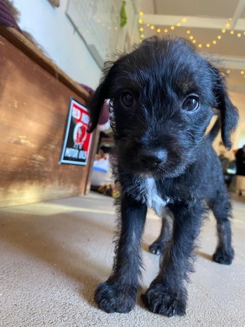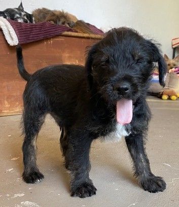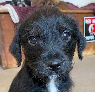 There was a mixup on the puppy assembly line. They put a big dog in a small dog’s body. Huey is cool, calm and kinda bored with it all. He plays with his brothers to humor them but he’d rather be napping and snacking. Or maybe it’s the growth spurt he’s experiencing in his legs mainly. He’s so tall for a 4 pound 8 week old scruffy mix of terrier types. He’s beyond adorable.