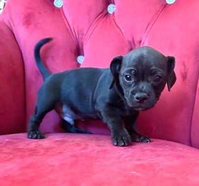 He's out of this world! Jupiter is 8 pounds of squishy sweet love. He’s around 4 months so we figure he’ll be about 15 pounds full grown. Although he looks like a tiny black lab, he’s a pug chihuahua mix. He’s pretty laid back for a puppy and he loves to snuggle on laps. He gets along well with all dogs and humans!