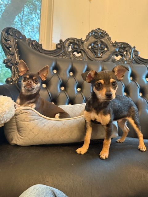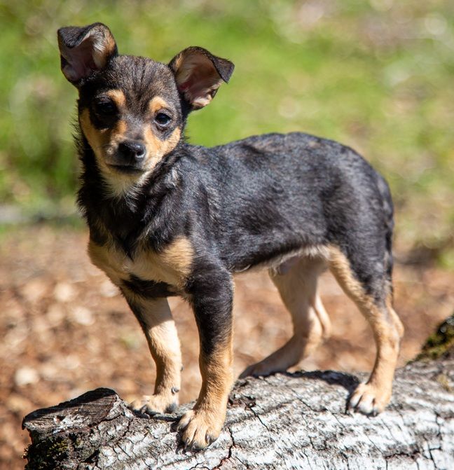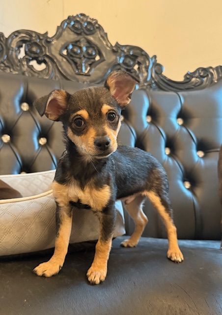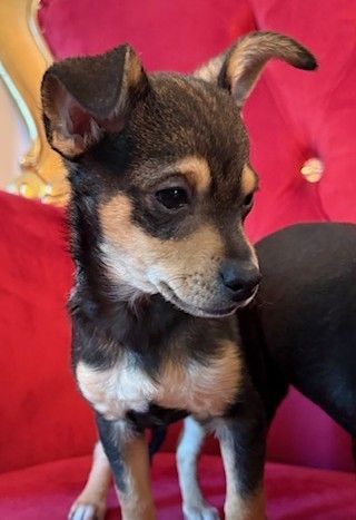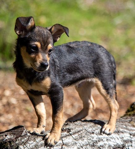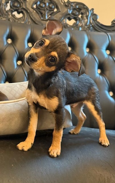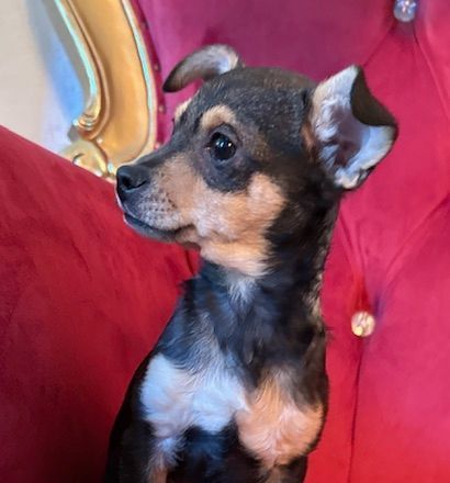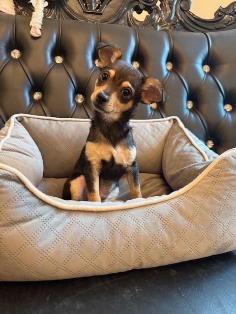 This precious little four pound nugget has got the coolest look and the most chill personality. Lemming and his fuzzy littermates are around 3 months old and they’re all around 4 pounds. They have the coolest hair, it’s kinda thick and curly in spots and their tails have twisted hair all the way to the end, like a spiral. They’re absolutely gorgeous puppies so their parents were likely stunning but we don’t know anything about them. We joke that they may be toy Rottweilers (it’s not a thing) because that’s the best way to describe them!