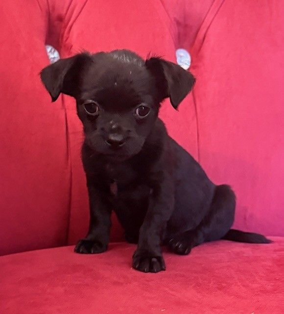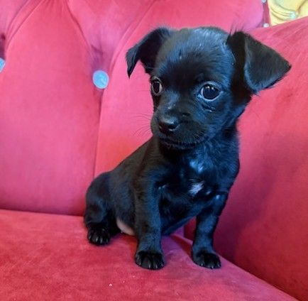 These pups came from a pretty sad and filthy hoarding situation so they have some skin issues which are clearing up, thanks to our wonderful veterinarian and proper care. There is a patch of missing hair that is growing back on Malala‘s little head. She is just a sweetheart. She’s much fluffier than her siblings and is sweet like her mom.