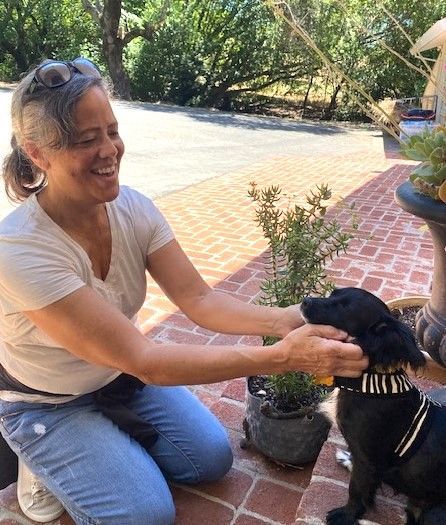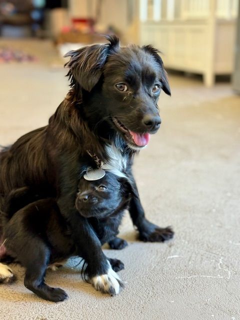 Peone never missed a beat in caring for her pups, and warmed up to us quickly. Now she loves attention, snuggles and walks. Peone is young, probably 1 or 2 years old and she’ll probably weigh about 12 pounds when she’s finished nursing. We love her and so will you! She’s great with other dogs and is eager to please.