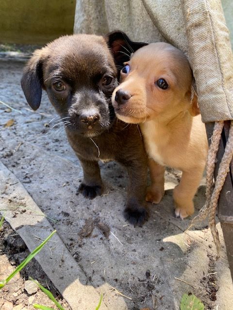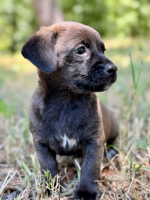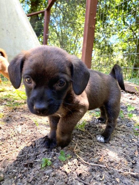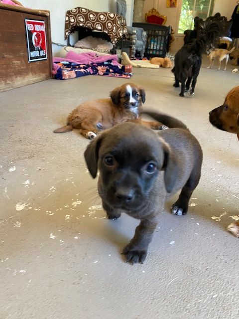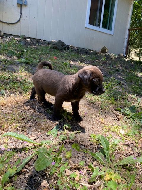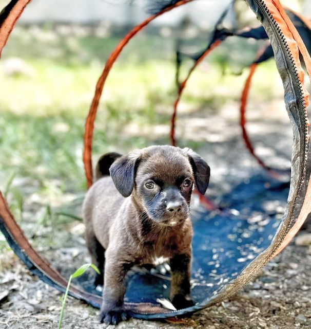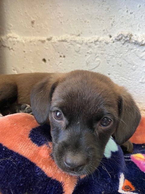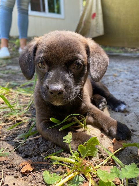 Meet our toy chocolate lab. Petunia has the laid-back attitude of a big dog in a 2.5 pound body. Of course she’ll be “huge” someday like her 13 pound mama. This 8-week old teddybear is still growing into her huge head so please don’t stare in the meantime. All kidding aside, she’s a doll and she’s cute as a button! We don’t know who dad is but he may have a big head.