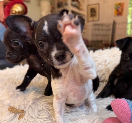 Pink is just 8 pounds and the other pups are also on the tiny side. They are, at the time of this post, 8.5 weeks (born 1/23/26), and still nursing on mama. We know nothing about their father but they have the best dog mom in the world, clearly.