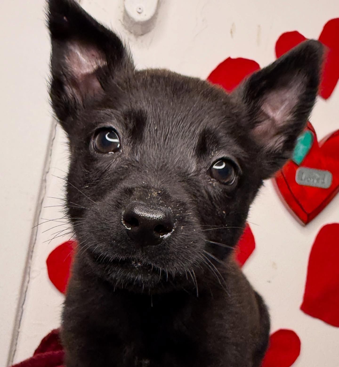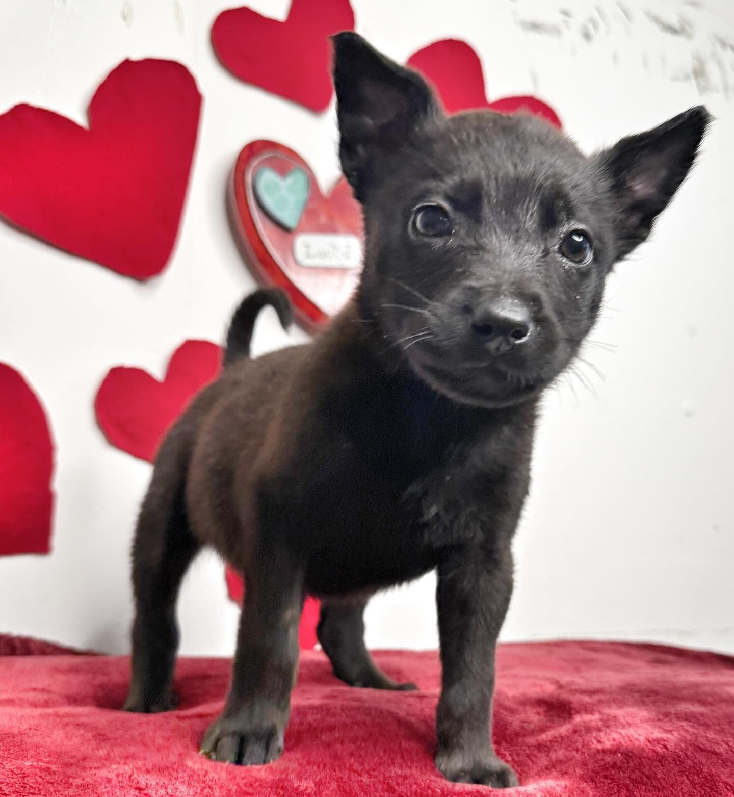 This amazing little girl was tied to a pole at night in a church parking lot, severely dehydrated and starved. If that wasn’t enough, she was full of roundworms... but Poptart is not just a lover, she’s a fighter, and she has overcome all that adversity. Her coat is a stunning mix of plush brindle and charcoal, heavy on the coal. Her ears are amazing, small, pointy and intimidating when she wears them straight up.