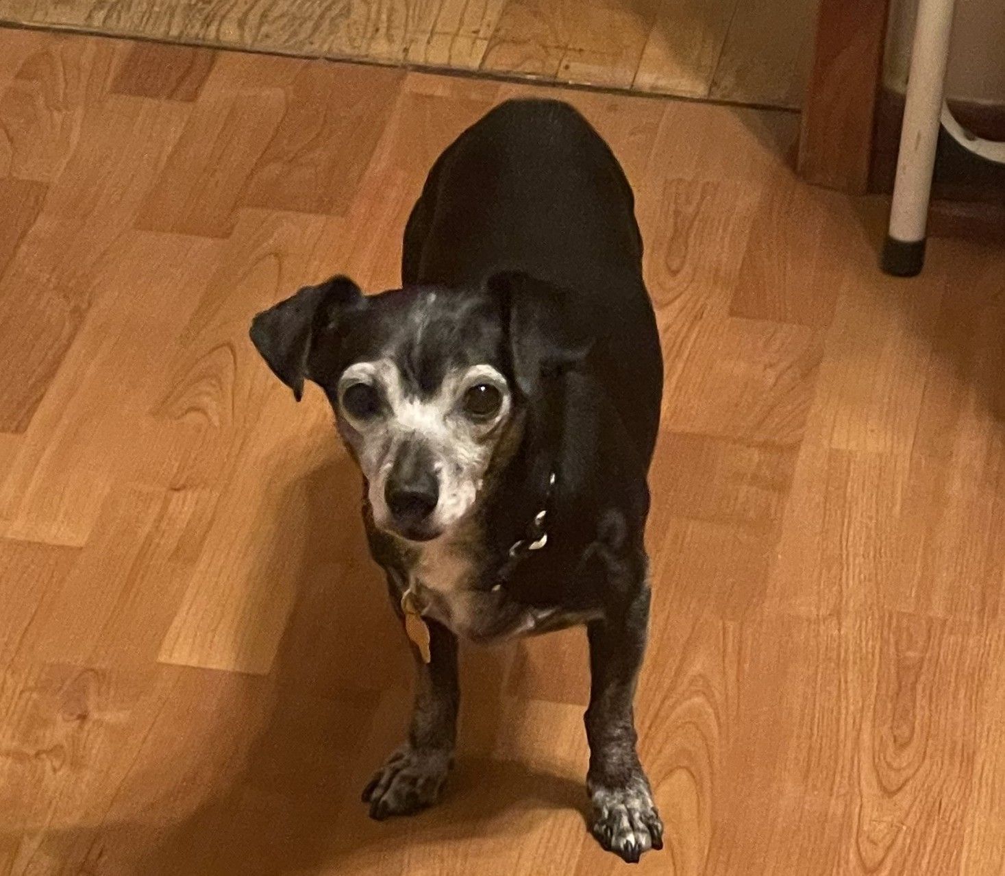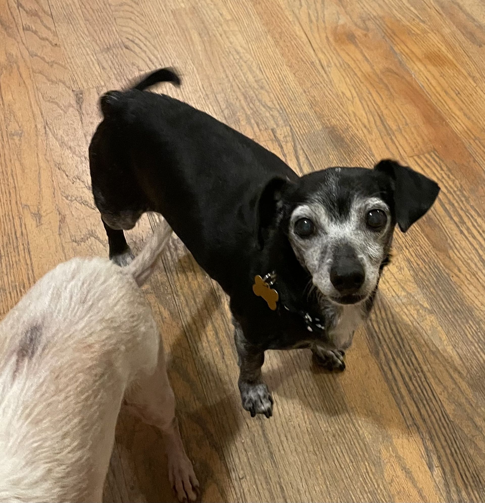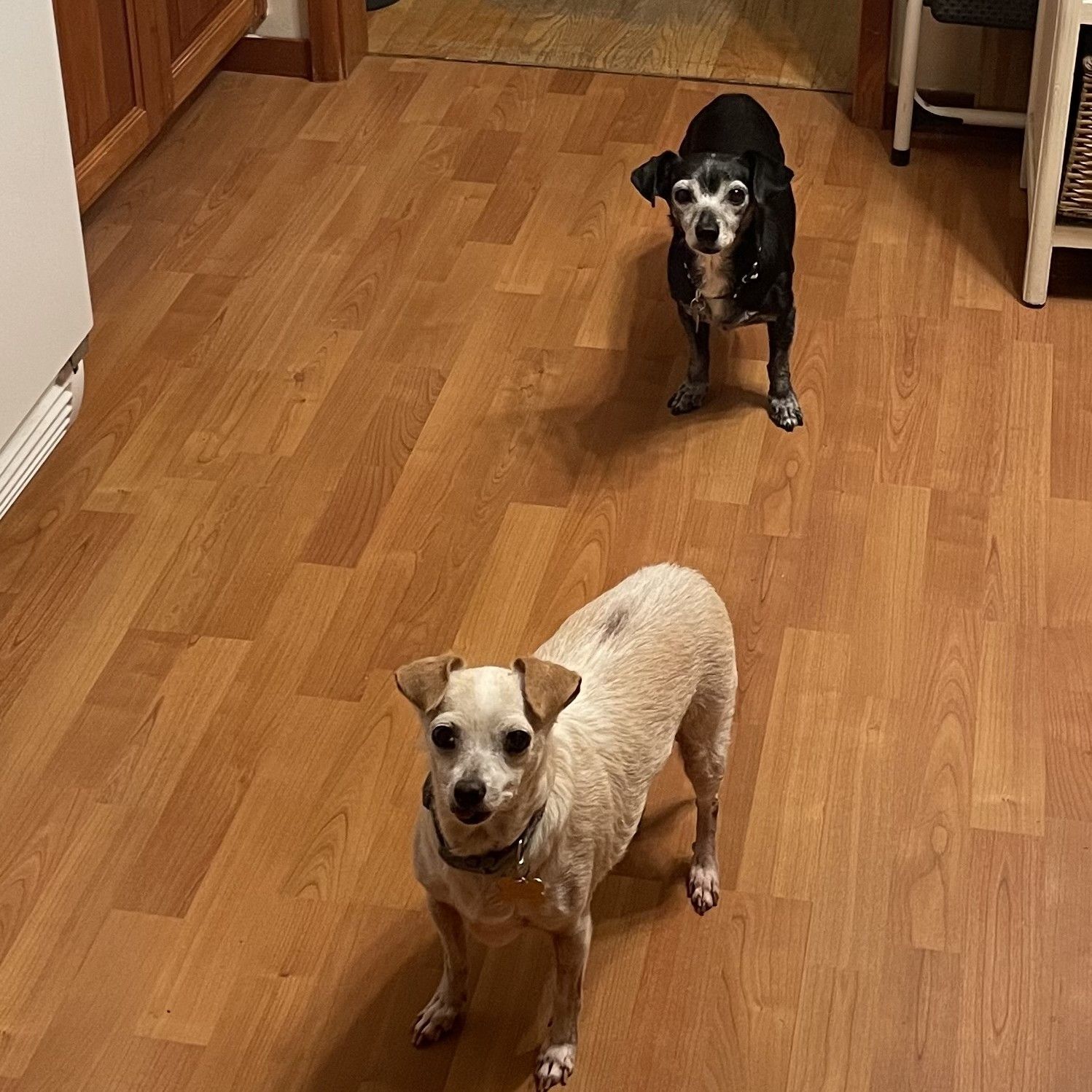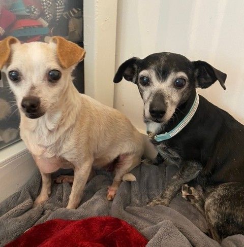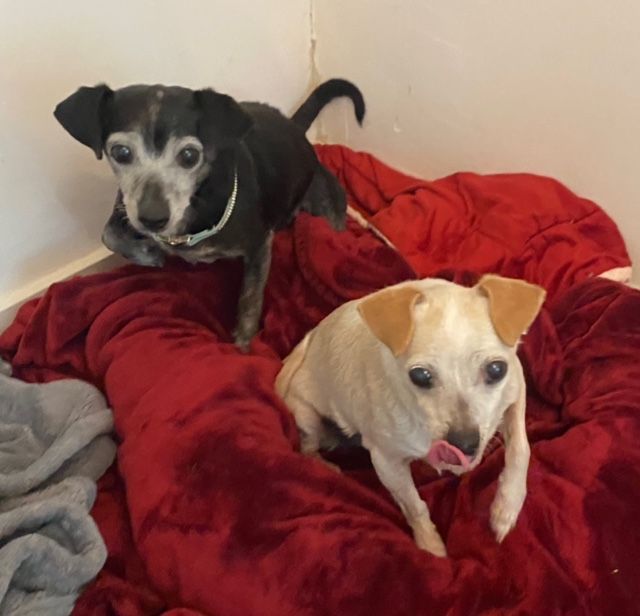 These poor little girls were locked outside and never touched for their entire 10/11 years of life. Despite the neglect, they are gentle and sweet but are incredibly shy. We can pet them and hold Sea Biscuit (the black one), but they tremble in fear. They need a quiet warm loving corner to decompress and learn to be loved. They will require patience and understanding. They will run to you when you come home; they love treat time, and while they're potty pad trained, they will potty outside as long as they have a doggy door or human person nearby to let them out.
