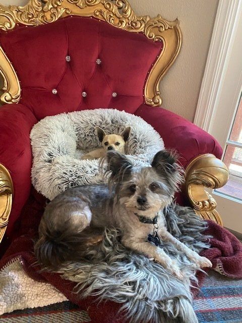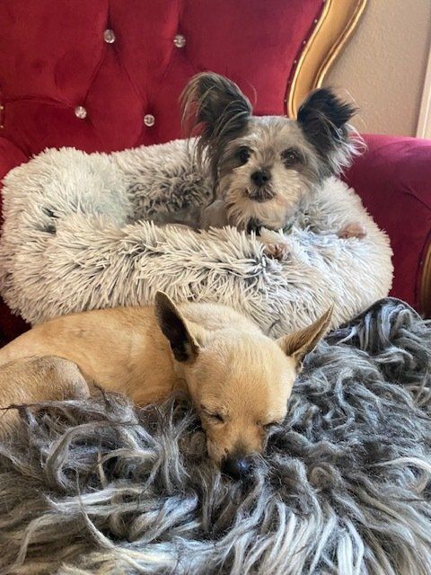 We still relish the idea of adopting these two as a pair, but we will certainly entertain their moving on to separate lives if the right situation presents itself. Either (or both) of them will bring lots of joy and love with minimal work or training. They deserve to live out their days in the comfort of a loving home, since we believe they lived outside for most of their years. They were covered in ticks and fleas when they were dropped at the pound but their scars are only skin deep. They have nothing but love for all.
