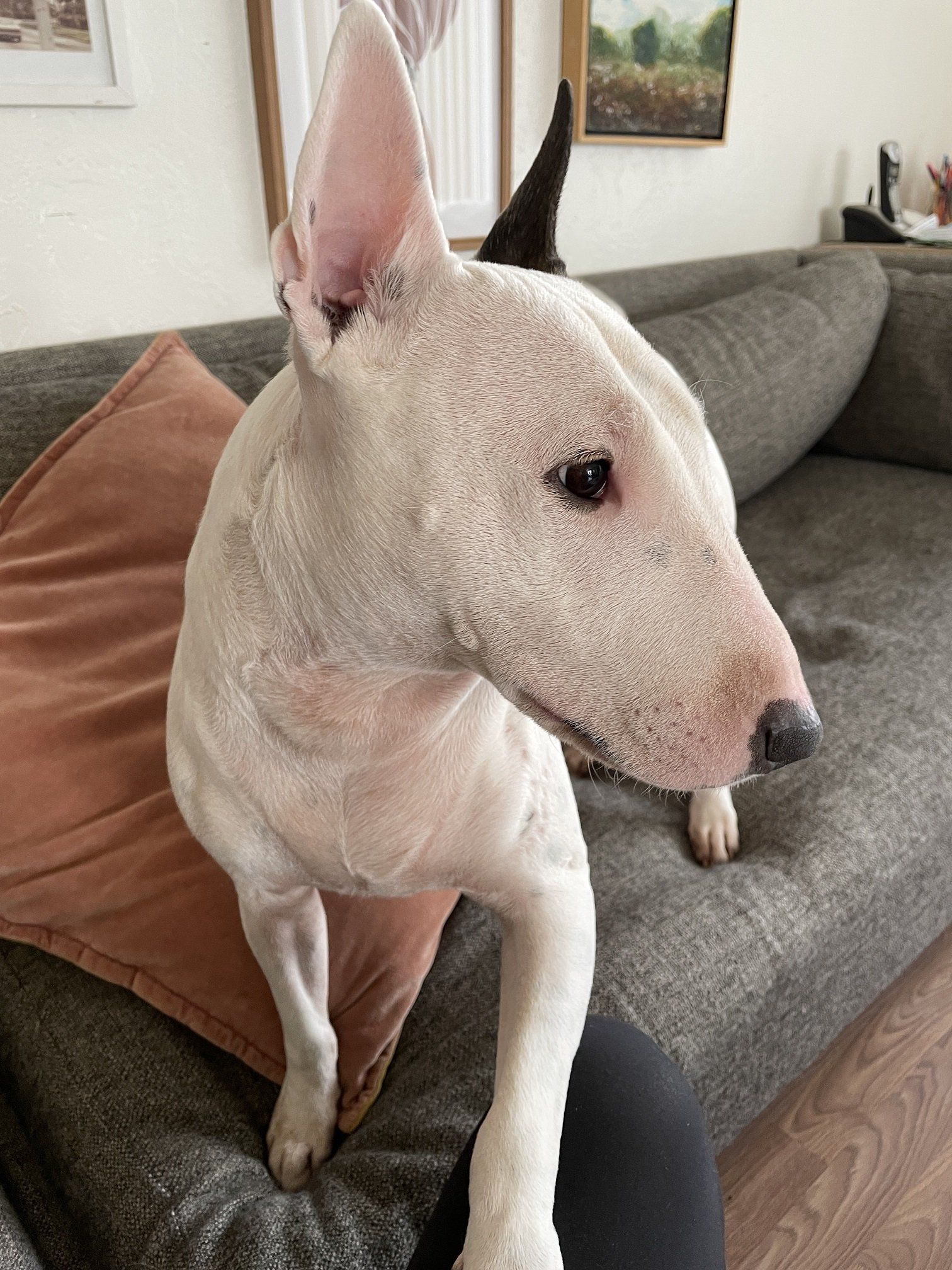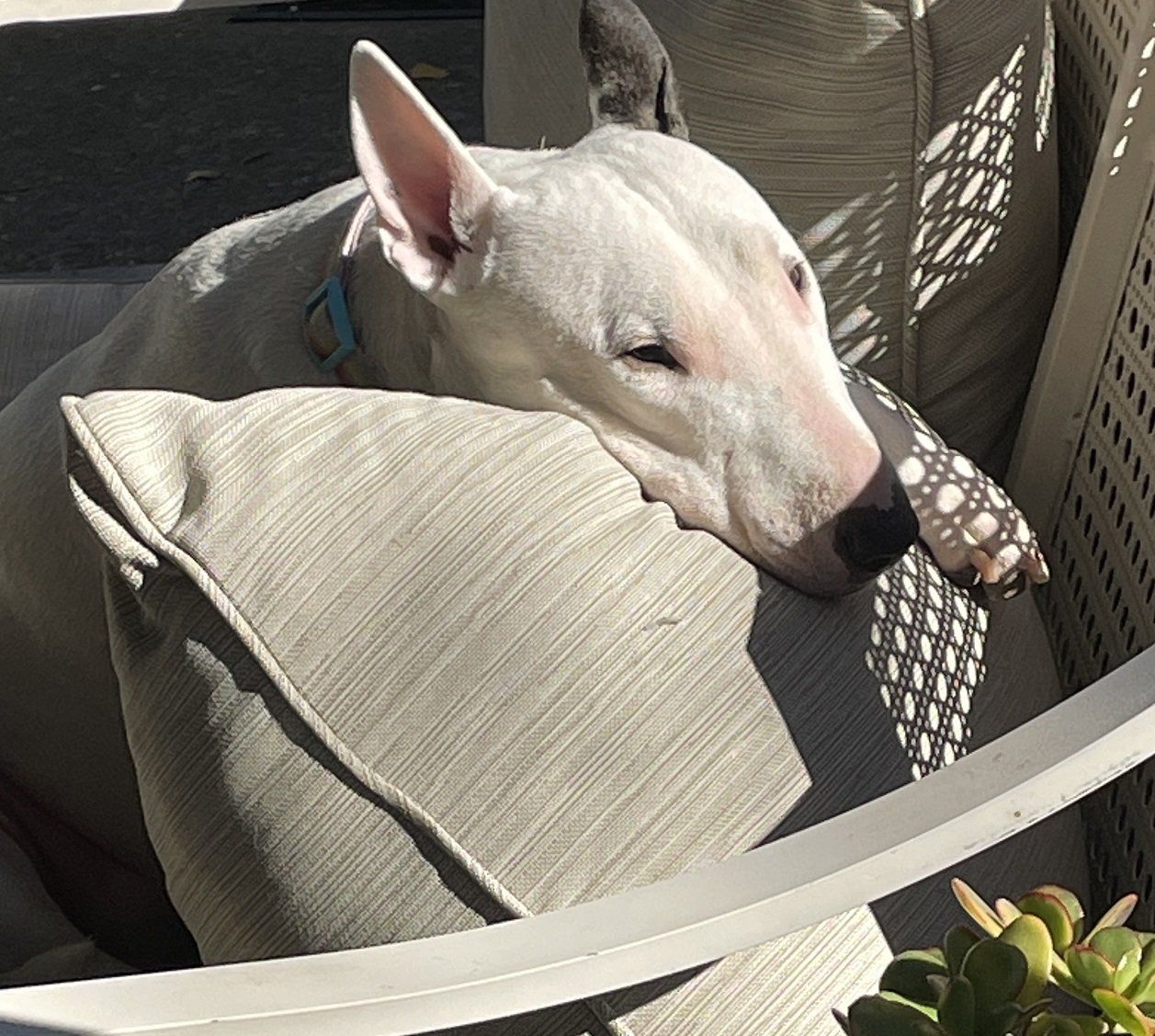 Please meet Sugar. She's a 3.5 year old Bull Terrier and a complete snuggler and lap dog. She is super smart and loyal with no fleeing response. She won't leave the yard without you.