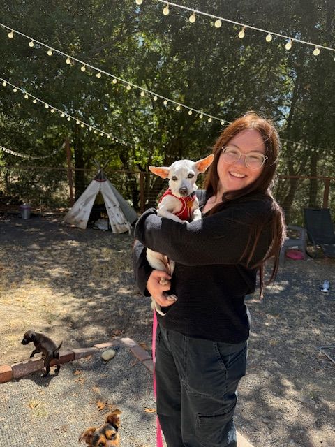 Sunny is the snuggliest sweetheart you’ll ever meet and she wants to be with her people 24/7. She doesn’t have separation anxiety but will follow her people all day long. She’s a bit underfoot so her family will need to be aware and surefooted.