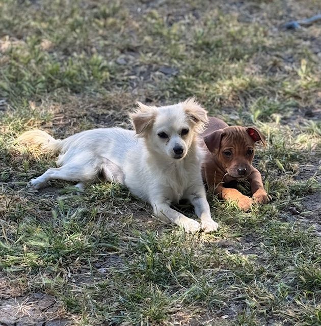 Tessa and Kevin were found in a pen on the side of a river with a bunch of other sick and terrified dogs. She’s only a few years old but she’s been through a lot. Luckily she’s learning to love life. She plays well with other dogs and she loves puppies. It will take her some time to trust humans but she’s on her way and she’s well worth the wait.