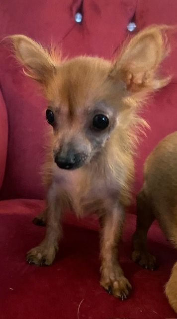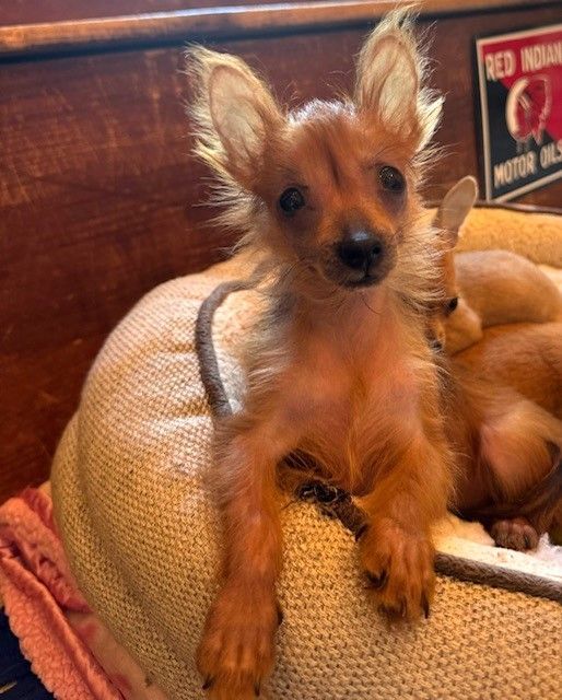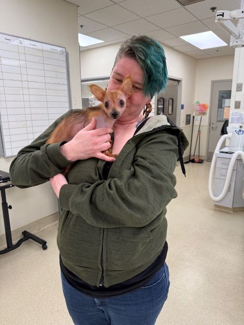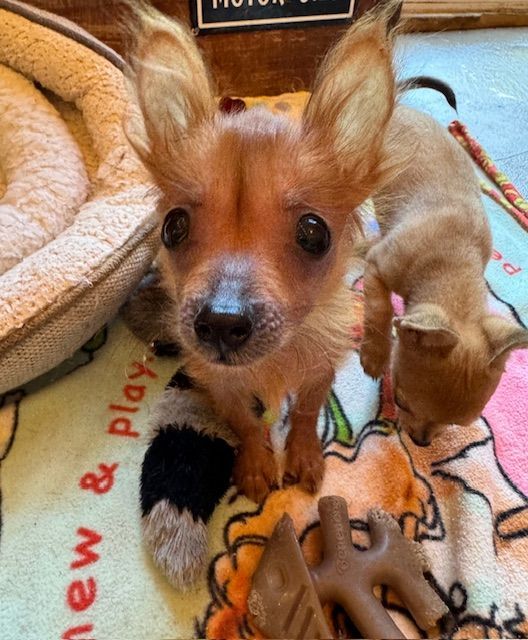 This is an incredibly unique and precious little being. She has the same "mystery condition" as her cousin Werewolf. They came from a hoarding situation with 57 dogs but they are sweet as can be since they arrived as puppies. Wolverine has a recessed vulva which means she may be susceptible to UTI’s and or skin infections but otherwise she is a happy puppy. She’s very vocal and has energy for days but her sweetest feature is her prance. It’s very dramatic and fun to witness.